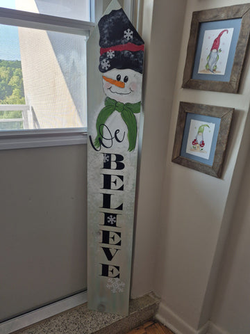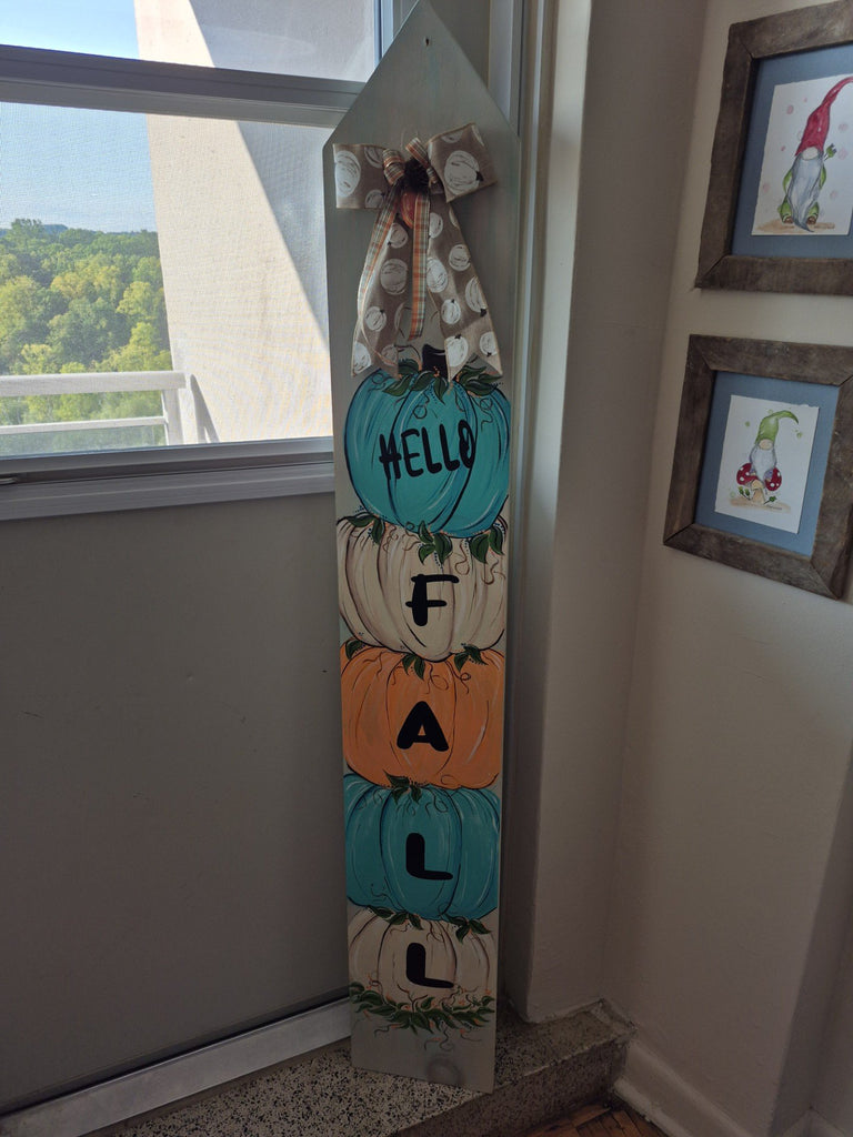 Hand painted on both sides. Fall pumpkins on one side, snowman we believe on the 2nd side